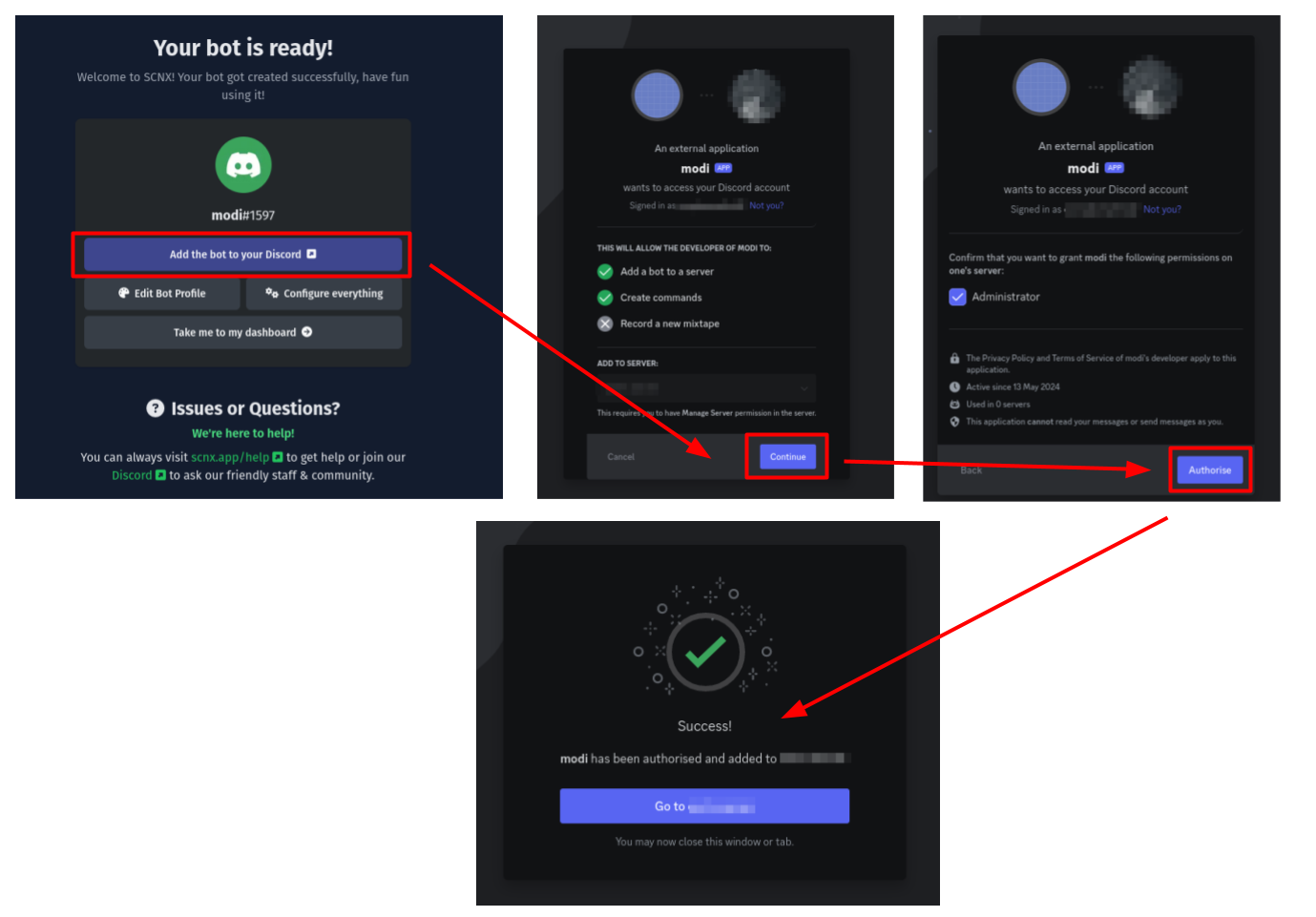 Nachdem SCNX deinen Modmail-Bot eingestellt hat, musst du deinen Modmail-Bot auf deinen Server einladen. Um dies zu tun, musst du nur auf den "Füge den Bot zu deinem Discord Server hinzu"-Knopf. Dies wird ein Fenster öffnen. SCNX hat bereits deinen Server ausgewählt. Klicke einfach auf "Weiter" und "Autorisieren" um den Prozess fertigzustellen. Wenn du möchtest, kannst du die "Administrator" Berechtigung entfernen, aber dies wird es schwieriger machen, den Bot normal zu nutzen, da SCNX noch nicht zeigen kann, welche Funktion welche Berechtigung benötigt und Fehler, die auf fehlende Berechtigungen zurückzuführen sind, zu erkennen.